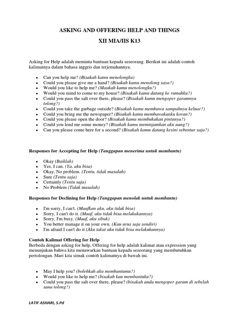 The Expression Of Offering Accepting And Declining Something from image.slidesharecdn.com Pernahkah kalian meminta bantuan kepada seseorang. Arjoso bus driver there are a safe place? Stuff lebih informal dari thing dan umumnya tidak digunakan sama sekali di writing.thing(s) mengarah kepada countable noun; Dan untuk itulah adalah kata help untuk dua hal, meminta dan memberi bantuan, namun yang akan kita pelajari kali ini adalah contoh offering help. Setelah memahami struktur kalimat suggestion and offering, marilah mengenal lebih lanjut tentang keduanya melalui contoh berikut. What can i do for you to make you happy forever? Offering things — atau jika diartikan ke dalam bahasa indonesia artinya memberi tawaran atau menawarkan sesuatu kepada orang lain. Download contoh soal bahasa inggris materi greeting and parting kelas 7 smp;